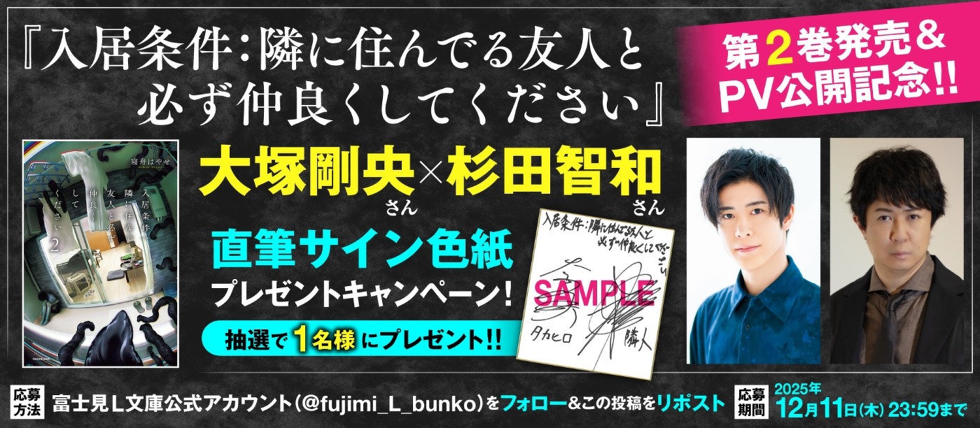 2巻発売とPVの公開を記念して、PVでキャラクターを演じてくださったお二人の合同サイン色紙を抽選で1名様にプレゼントいたします!