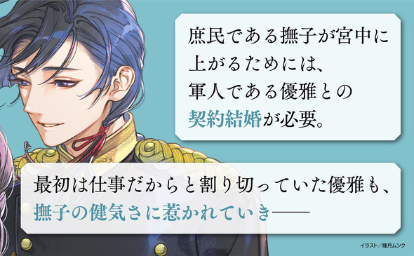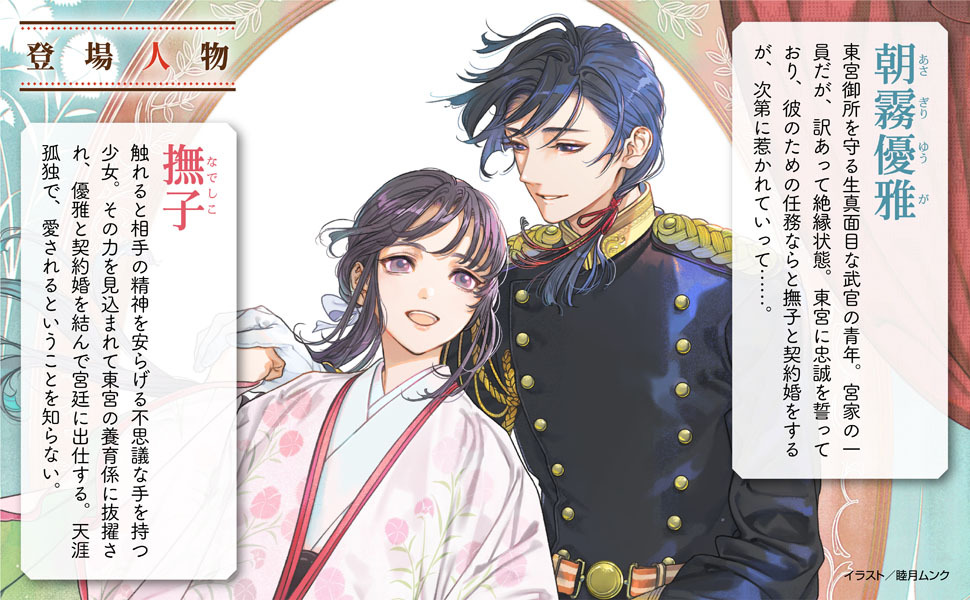 ある時、勤め先の主人に迫られていたところを皇宮軍人・朝霧優雅に助けられる。撫子の力を知ることとなった優雅に、「厳しい教育で心を患ってしまった帝の御子――幼い東宮さまの心を癒やしてほしい」と頼まれ、撫子は彼と契約婚を交わして女官として宮廷に上がることに。